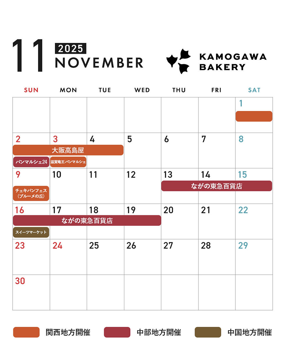 • 催事に関するお問い合わせは、KAMOGAWA BAKERYではなく、恐れ入りますが各施設・主催者様へお願いいたします。